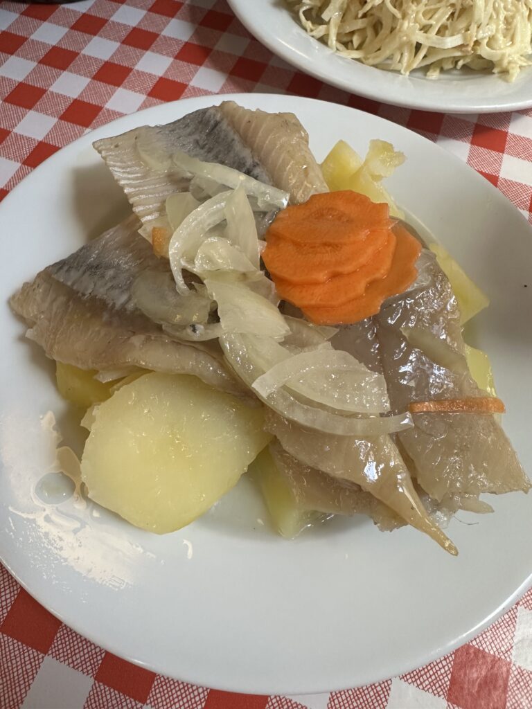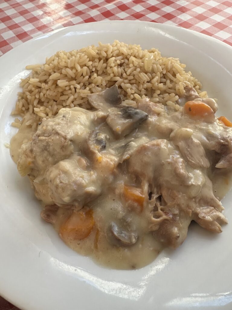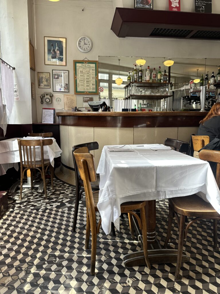 Œuf mayo, céleri rémoulade, harengs pommes à l’huile, faux filet aux haricots verts – un peu ramollos ces derniers -, mais superbe blanquette de veau, délectable mousse au chocolat ou braves oeufs en neige s’arrosent plaisamment de chiroubles Bel Air du château de Raousset 2023.