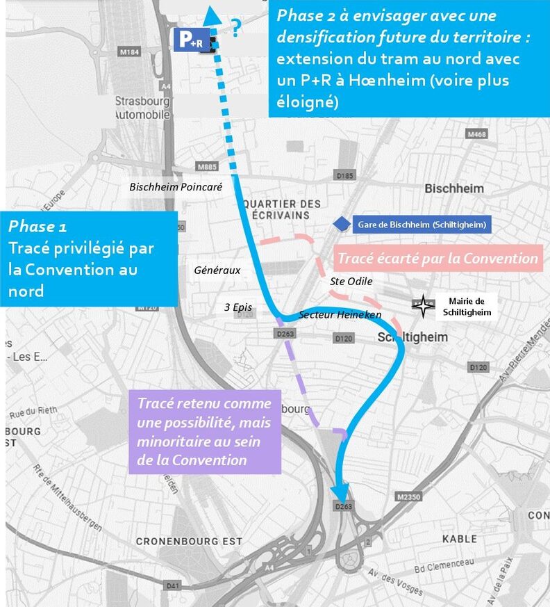La convention citoyenne n’a en revanche pas atteint de consensus sur la partie strasbourgeoise du tram nord. Les citoyens proposent aux élus quatre tracés. Le favori (avec 86,4% des votes) prévoit de rejoindre directement le centre de Strasbourg, place Broglie, en passant par la rue du Faubourg-de-Pierre. Un deuxième tracé, vers la gare de Strasbourg par le boulevard Wilson n’a obtenu que 63,8% des suffrages tandis qu’un troisième tracé, vers la place de la République par l’avenue des Vosges n’a obtenu que 48,8% des votes. Le quatrième tracé, par la rue Jacques-Kablé et la place de Bordeaux, n’a été retenu que par 42,5% des citoyens participants.
