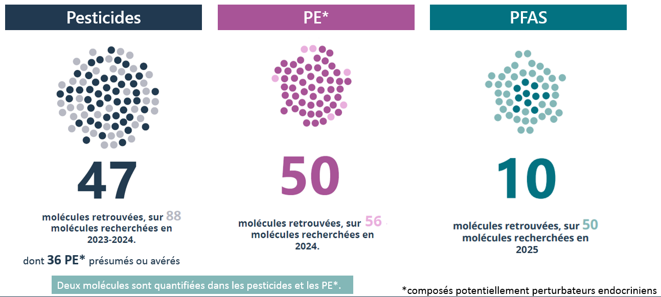 Ce dispositif permettra de suivre la multi-exposition : pesticides/molécules potentiellement perturbateurs endocriniens/PFAS et d’avoir des informations plus complètes des expositions combinées.
