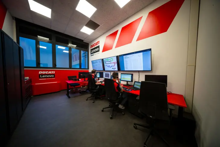 Pendant un week-end de course, une équipe de base se rend sur le circuit, mais à Bologne, le « garage à distance » tourne également. « Nous avons toujours des ingénieurs à domicile qui travaillent en temps réel », explique Tardozzi. « Grâce à des connexions redondantes – Starlink, 4G et lignes locales – ils sont presque littéralement présents dans le garage. »