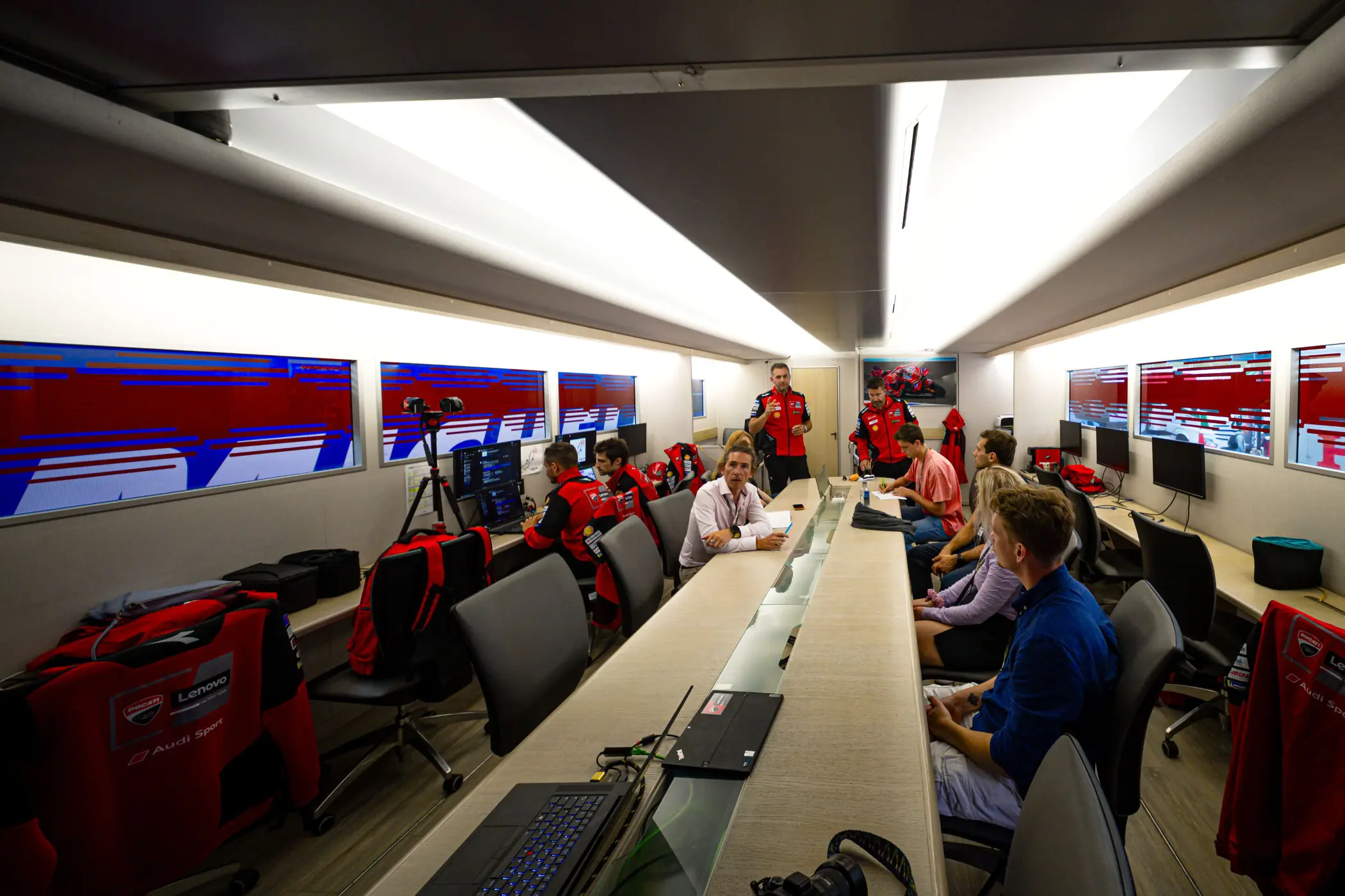 Où pourrions-nous mieux fêter cet anniversaire que dans le garage et l’hospitalité de l’emblématique Ducati Corse. Tout comme en F1, il y a aussi une mystique autour de la couleur rouge en MotoGP. Cela tombe bien que le logo de Lenovo, qui nous a invités à un week-end de course, soit du même rouge que la Desmosedici (la moto de Ducati).