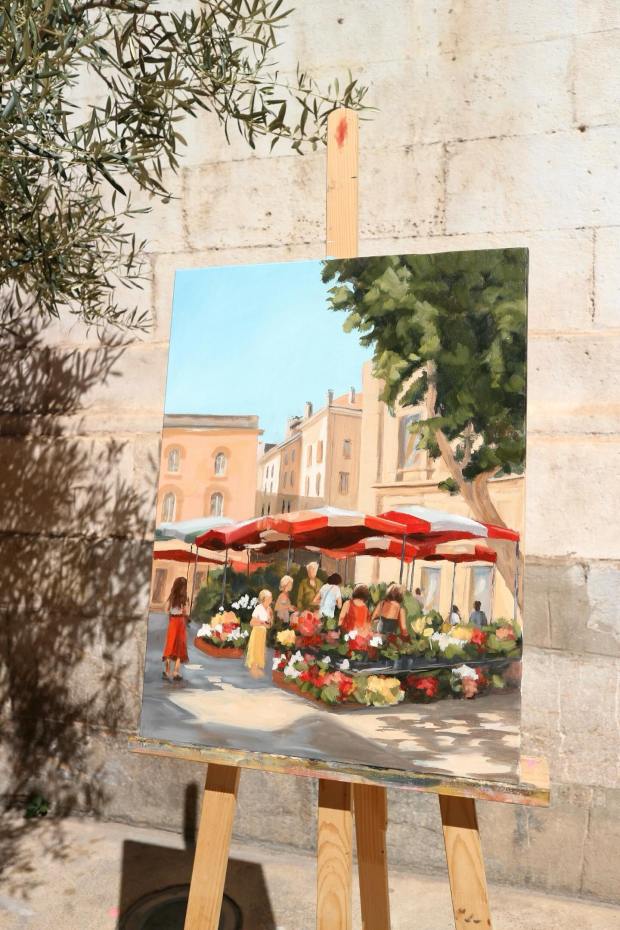 A Toulon, Eléonore a trouvé les paysages et les ambiances qui l’inspirent. « En Provence, il y a une lumière particulière, très belle. Elle nourrit mes tableaux de ses couleurs chatoyantes et de beaucoup de joie. » Pour sa troisième collection, la jeune artiste est éclairée par l’œuvre du peintre espagnol Joaquìn Sorolla (1863-1923), connu pour ses scènes baignées de lumière méditerranéenne. Entre marchés aux fleurs, bâtisses ocres et arcades de la vieille ville toulonnaise, les toiles d’Eléonore reflètent la vie calme et ensoleillée du Midi.