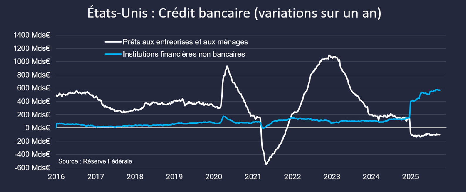 Les données historiques n’ont pas été ajustées, ce qui explique un saut en début d’année 2025 venant rompre la lecture de cette série statistique. La nouvelle classification permet néanmoins d’observer que depuis le début de l’année, 92% des nouveaux crédits bancaires ont permis de financer ces institutions financières non bancaires, bien plus que des entreprises ou des ménages.