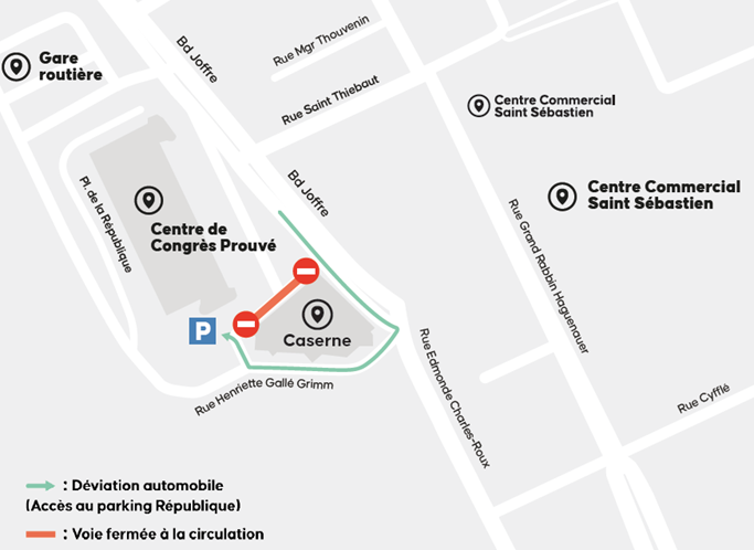Du 1er décembre au 19 décembre 2025, la rue desservant le parking République sera fermée à la circulation. L’accès se fera par la rue Henriette Gallé-Grimm. Le boulevard Joffre sera également fermé au niveau du carrefour avec la rue Saint-Thiébaut, dans le sens rue Saint-Thiébaut vers la rue Edmonde-Charles-Roux.