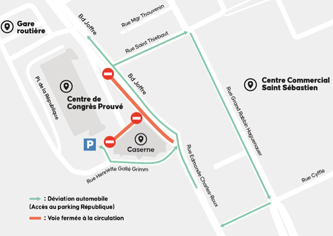 Du 3 novembre au 21 novembre, la rue desservant le parking République sera fermée à la circulation et l’accès devra s’effectuer par la rue Henriette Gallé-Grimm. Les bus et les livraisons en direction du centre des congrès devront quant à eux passer par la place de la République et sortant par la rue Henriette Gallé-Grimm.