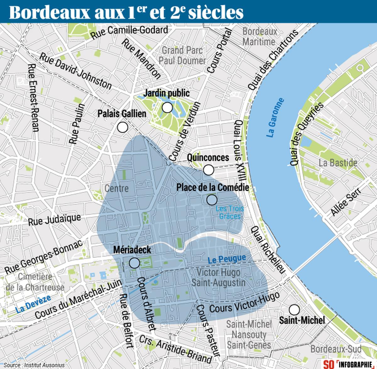Le travail est facilité par le nombre d’éléments archéologiques conservés par le musée d’Aquitaine. « Cette collection est énorme en termes de quantité, souligne Laurent Védrine. Elle provient pour l’essentiel des remparts du IIIe siècle, mais ces remparts ont été construits en réemployant des blocs issus de constructions plus anciennes. » Ils ont au départ été utilisés dans le Bordeaux des origines, dans un périmètre de 150 hectares délimité par les actuels quartiers Saint-Michel, Mériadeck, Jardin public et Quinconces. Bien plus grand que les 32 hectares dans lesquels la ville est ensuite restée circonscrite pendant un millénaire, entre le IIIe et le XIIIe siècle.
