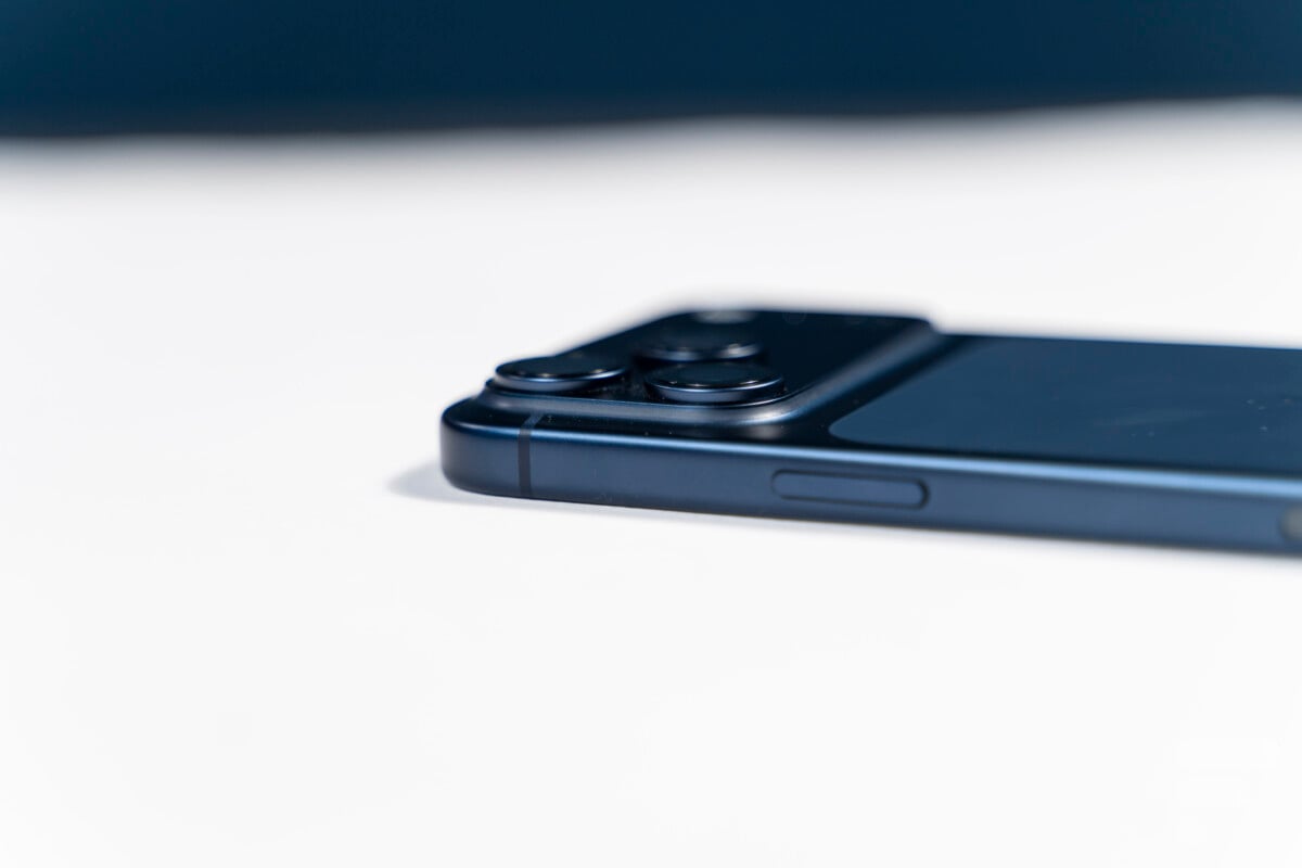 Le châssis principal est constitué d’un design unibody en aluminium, un choix de matériau qui tranche avec le titane des générations passées. Le dos, quant à lui, contient toujours une plaque en verre pour faire passer la charge sans fil. Ici, on a du Ceramic Shield 1. Si les premières photos m’avaient laissé dubitatif, le rendu final est plutôt réussi. Le contact offre une texture soyeuse, très agréable sous les doigts.
