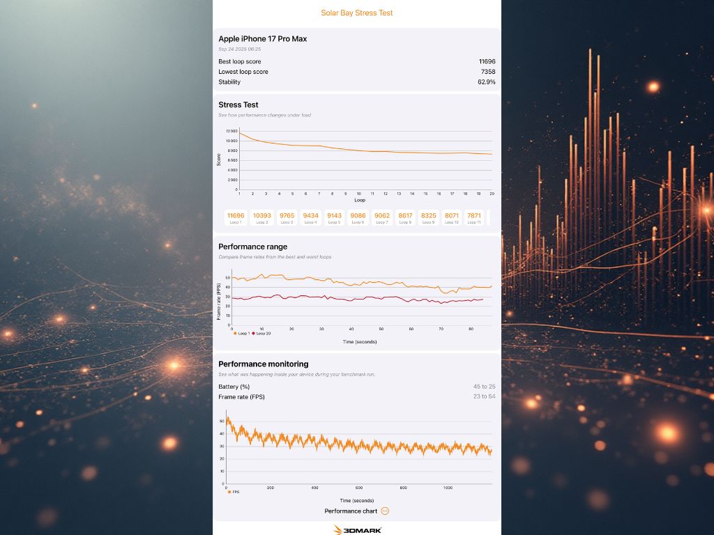 Cette meilleure gestion thermique se traduit par des scores excellents. Sur nos benchmarks, l’iPhone 17 Pro Max et sa puce A19 Pro ont atteint un résultat de 69 132 points. C’est une progression significative par rapport aux 61 540 points de l’A18 Pro de l’iPhone 16 Pro Max, soit une différence de plus de 12 %.