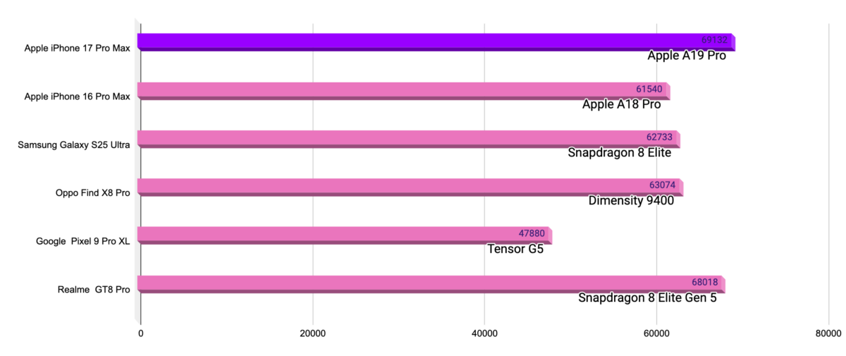 L’écart se maintient face à la concurrence. Le Snapdragon 8 Elite du Galaxy S25 Ultra, avec ses 62 733 points, est nettement distancé. Même le tout nouveau Snapdragon 8 Elite Gen 5, qui commence à peine à équiper les smartphones de nouvelle génération, fait moins bien que la puce d’Apple, du moins sur le prototype de GT 8 Pro que nous avons pu tester.