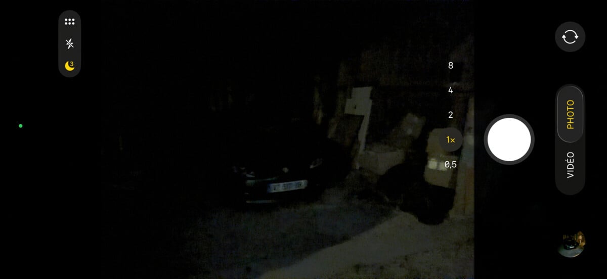 Mieux, dans des conditions de quasi-obscurité, comme avec la voiture ici, l’iPhone pousse pour capturer un maximum de lumière, acceptant un léger bruit en contrepartie d’une meilleure lisibilité de la scène. De manière générale, le niveau de détail reste élevé et le rendu naturel grâce à un traitement logiciel qui trouve un juste milieu entre réduction du bruit et conservation des textures.