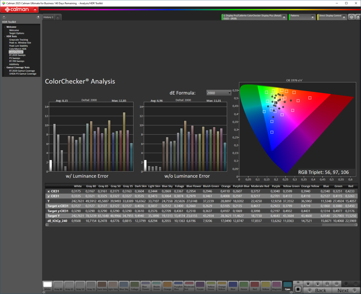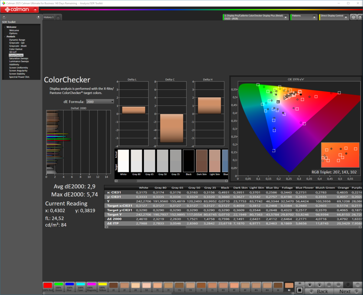 Apple promet des chiffres de luminosité très élevés. La fiche technique annonce 1000 nits en usage standard, un pic à 1600 nits pour les contenus HDR et même une poussée jusqu’à 3000 nits en extérieur. Une fois l’écran passé sous notre sonde et analysé avec le logiciel CalMAN Ultimate de Portrait Displays, les résultats sont, comme souvent, un peu différents, mais restent excellents.