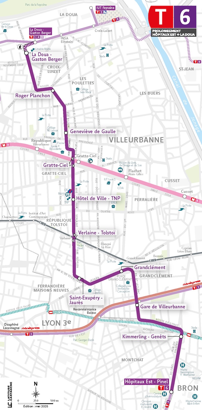 D’un coût total de 185 millions d’euros, le prolongement reliera quatre pôles urbains majeurs : les Hôpitaux-Est, Jules-Grandclément, les Gratte-Ciel et le campus de la Doua. Avec une fréquentation estimée à 55 000 voyages par jour, le T6 deviendra la première ligne interurbaine en rocade du réseau TCL, connectée aux lignes fortes existantes (métros A, B, D et tramways T1, T3, T4, Rhônexpress).