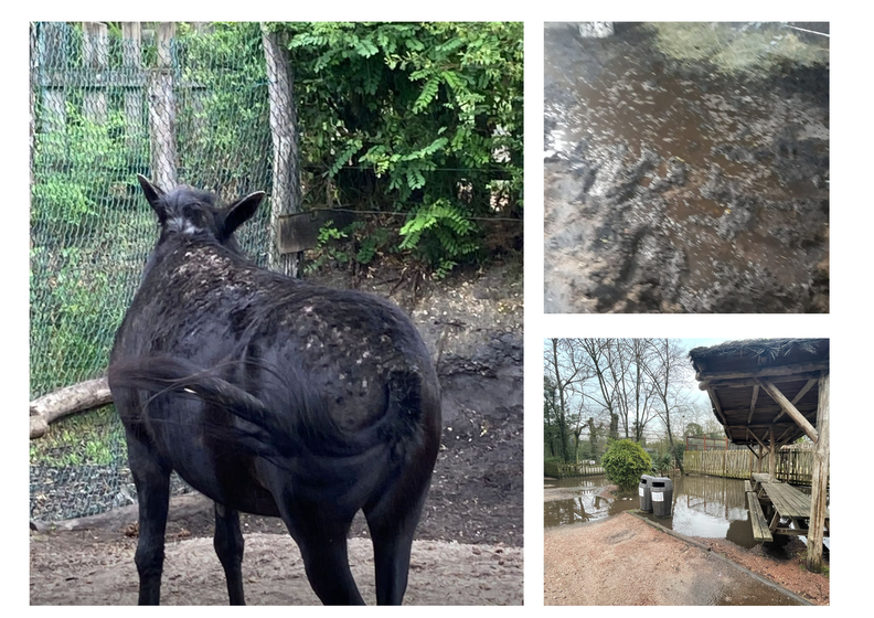 « À l’hiver 2023-2024, les allées et plusieurs enclos étaient inondés, y compris celui des gibbons, et à force de rester dans la boue, le mulet a fini par développer la gale ; dès mon arrivée, on pariait déjà sur qui serait le prochain à démissionner », témoigne un employé en poste entre 2023 et 2025. Photo : Documents remis