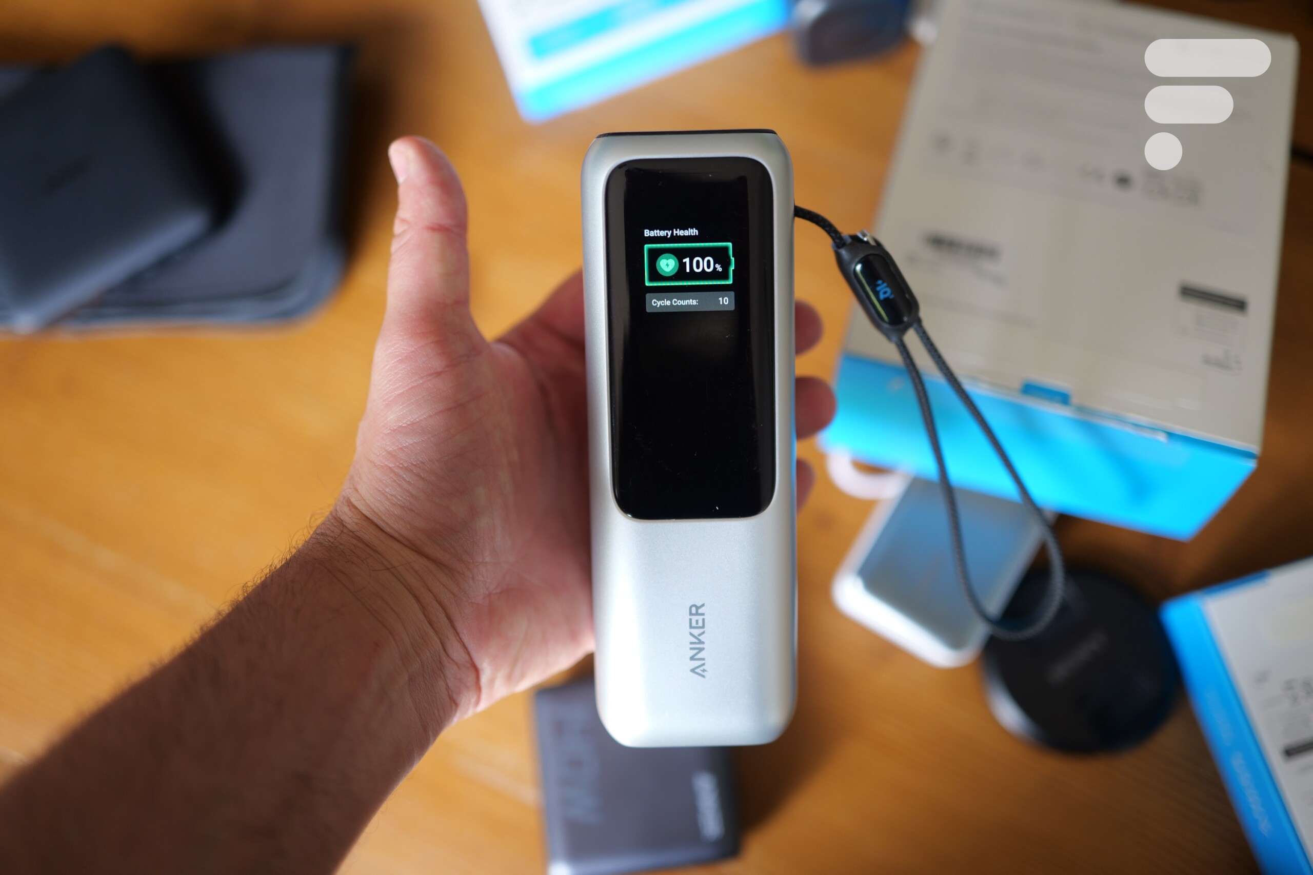 Si l’Anker Zolo figure parmi nos batteries externes coups de cœur, c’est en partie pour sa conception vraiment bien pensée. Elle est par exemple équipée de deux câbles rétractables, un de 70 cm et un plus court de 30 cm qui fait aussi office de poignée de transport. Hyper pratique au quotidien, donc. Notons aussi la présence d’un écran qui affiche un tas d’informations utiles, comme la température de la batterie, la puissance d’entrée et de sortie ou encore l’état de santé de l’appareil.