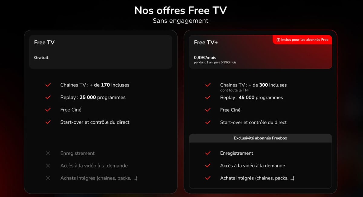 Free TV+ est incluse pour les abonnés Freebox et les abonnés mobiles Free 5G et Série Free. Autrement il est commercialisé à 5,99 euros par mois (0,99 euro/mois la première année).