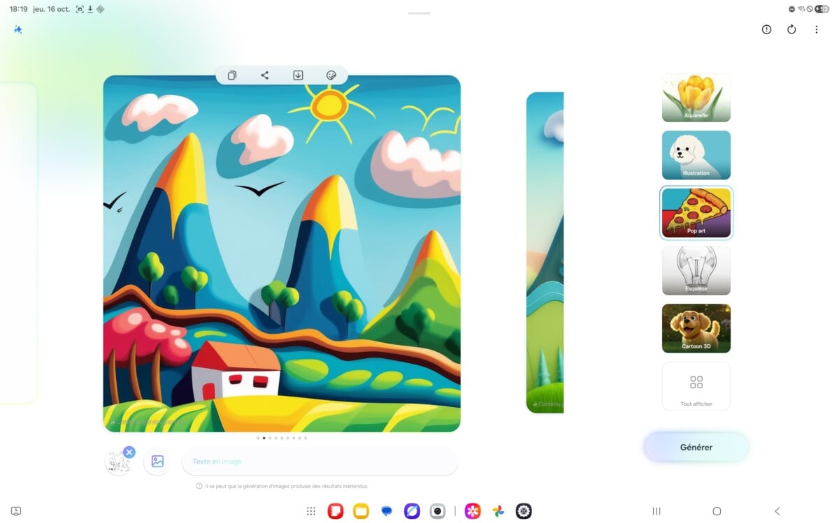 On y trouve également l’outil Croquis génératif, qui permet aux graphistes plus ou moins doués de générer des dessins sophistiqués, juste en griffonnant une esquisse (grossière en l’occurrence dans les exemples ci-dessous) à l’écran, à l’aide du stylet S Pen. Bien sûr, on peut ensuite partager sa création avec ses proches ou la sauvegarder dans ses documents, afin de la retoucher par la suite, par exemple à l’aide de l’application PenUp de Samsung, installée par défaut.
