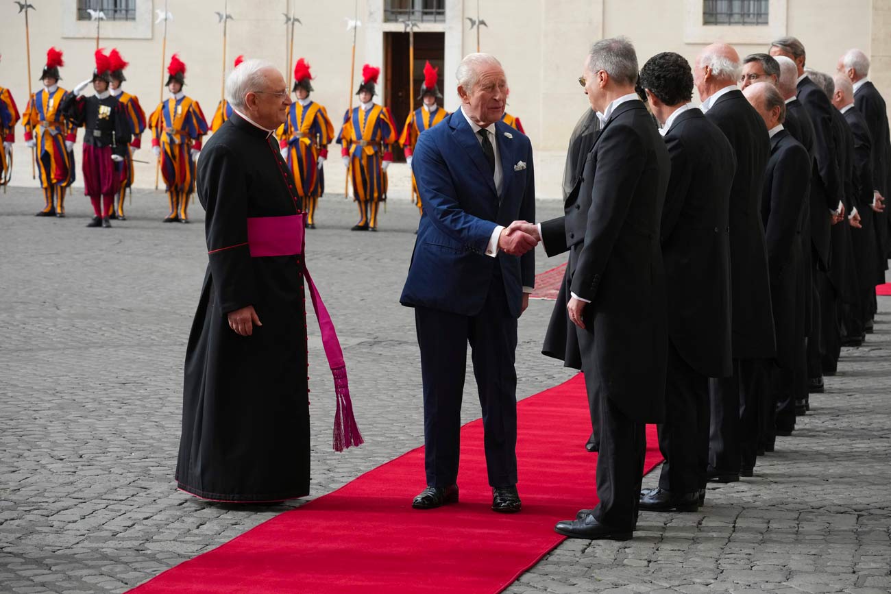 Le roi Charles III et la reine Camilla arrivent au Vatican, accueilli sur le tapis rouge par Mgr Leonardo Sapienza, régent de la préfecture de la Maison pontificale (Photo : Victoria Jones/Shutterstock/SIPA)