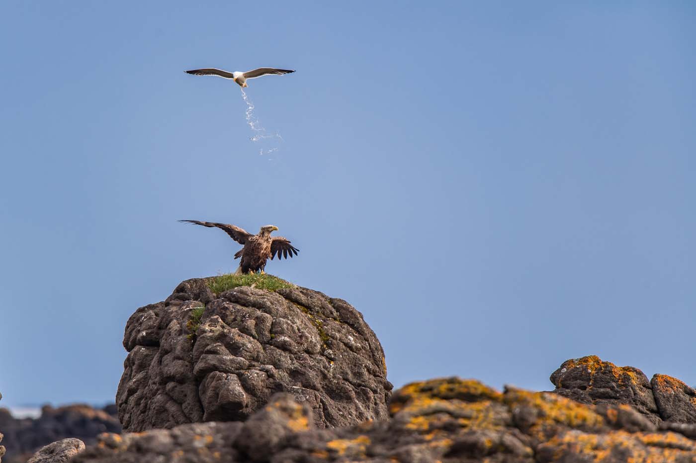 Mais la scène prend vite une tournure inattendue : « Un goéland est arrivé, et je pensais que l’aigle allait le chasser sans difficulté. Erreur ! Après plusieurs passages en rase-mottes, le goéland a changé de tactique… et a lâché sa “bombe” sur le roi du fjord ! »