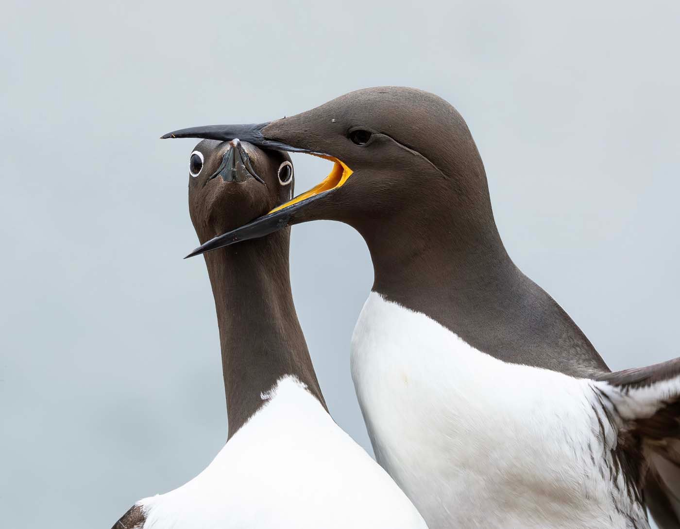 « Ces guillemots nichent sur une petite corniche rocheuse où la place se fait rare », raconte le photographe. « Les nids sont entassés, et chez les guillemots la promiscuité rime souvent avec bagarres : la territorialité est à son comble. » Il sourit en décrivant la scène capturée : « J’ai surpris ce guillemot au regard ahuri, la tête fermement prise dans le bec de son voisin – et il me regarde droit dans l’objectif, son “eye-liner” blanc soulignant à merveille sa situation. »