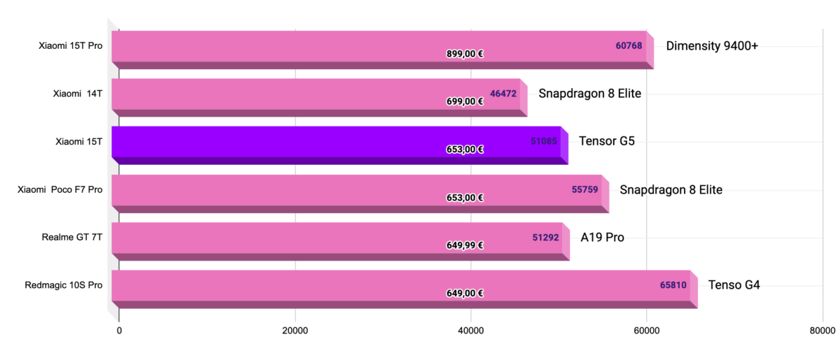 Bien évidemment, cette puce s’avère bien moins performante que le Mediatek Dimensity 9400+, qui équipe le Xiaomi 15T Pro, mais aussi la Galaxy Tab S11 Ultra de Samsung. Mais comment se comporte-t-il face aux puces présentes dans les autres smartphones de milieu de gamme ?