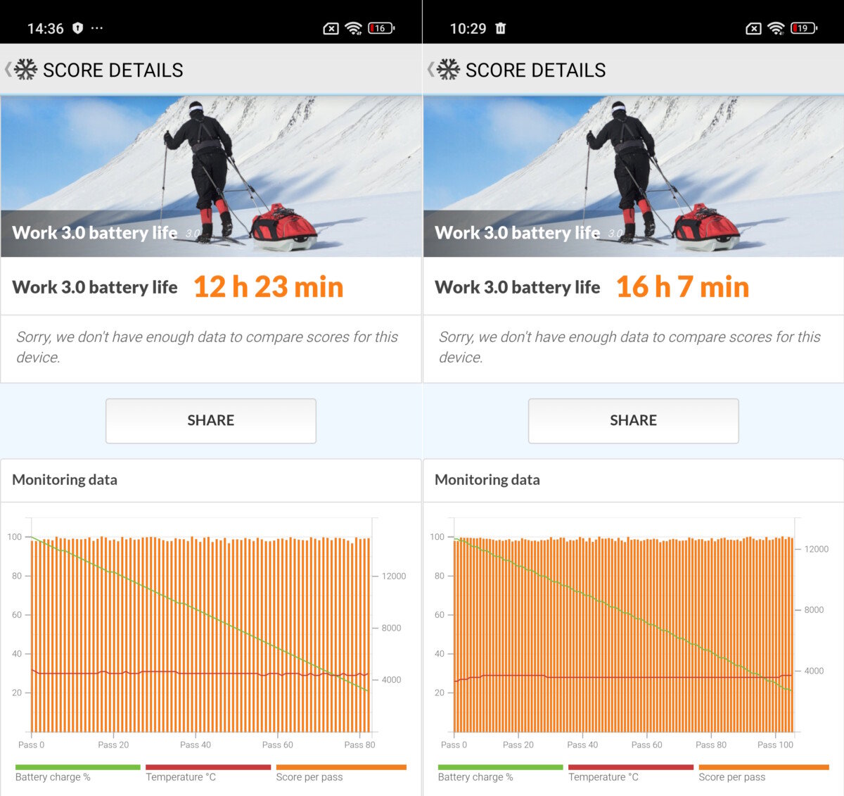 Ce dernier résultat – très bon dans l’absolu – s’avère nettement meilleur que celui obtenu avec la fréquence d’affichage variable, puisqu’il permet d’envisager deux journées d’utilisation (d’autant que la batterie dispose encore de 20 % de charge à la fin du benchmark).
