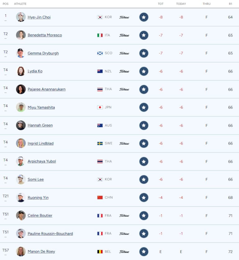 L’Italienne Benedetta Moresco et l’Écossaise Gemma Dryburgh sont à un coup, juste devant un groupe de sept golfeuses emmené par l’ancienne numéro un mondiale néo-zélandaise, Lydia Ko. La tenante du titre chinoise, Ruoning Yin, est 21e, à seulement quatre points de la tête (-4).