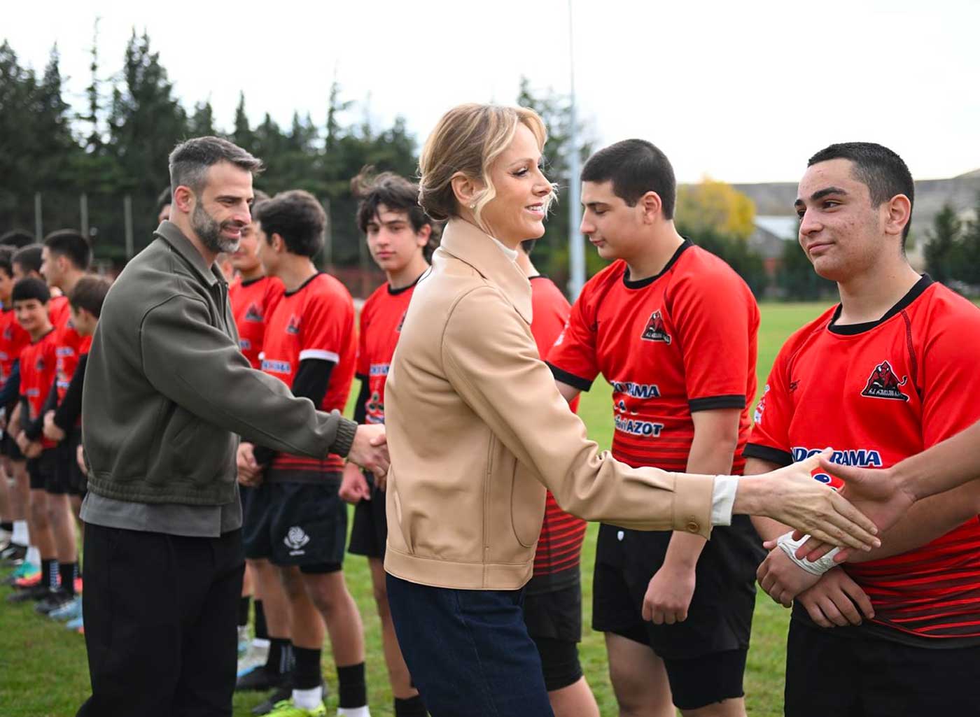 La princesse Charlène de Monaco salue les joueurs avant un match amical, suivie par Davit Kacharava, président de la Fédération géorgienne de rugby (Photo : Ana Demetrashvili / Georgian Rugby Union)