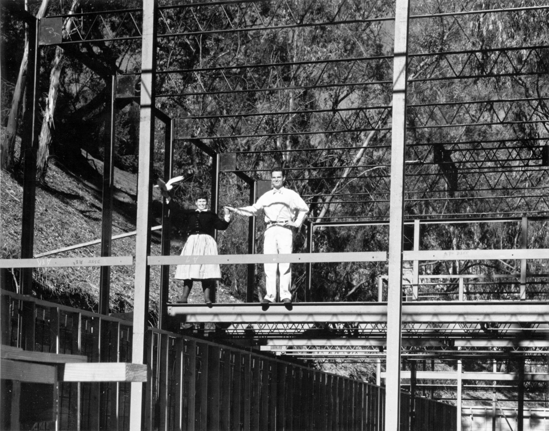 Charles et Ray posent sur la structure en acier de la future Eames House, 1949.