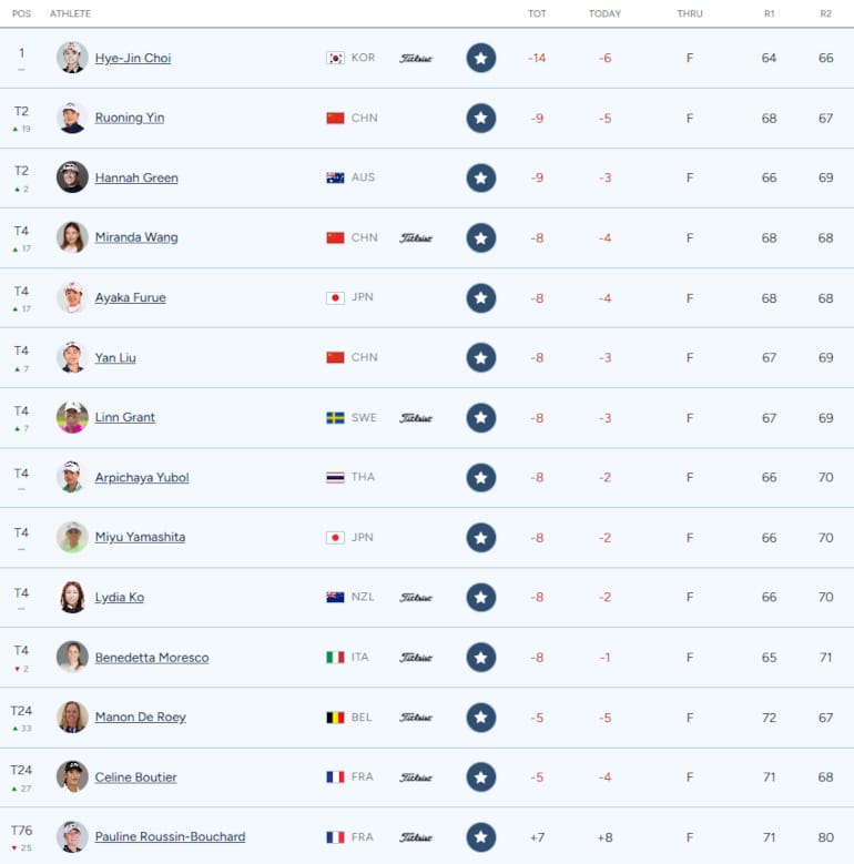 Huit golfeuses sont au pied du podium à la quatrième place, dont l’ancienne numéro un mondiale Lydia Ko, la révélation Miyu Yamashita et les Européennes Linn Grant et Benedetta Moresco. Pour retrouver trace de la deuxième Française engagée dans ce très prestigieux tournoi sans cut réservé à 78 privilégiées, il faut descendre très loin dans le classement. Pauline Roussin-Bouchard est passée complètement à côté de son deuxième tour avec notamment un aller en +5.