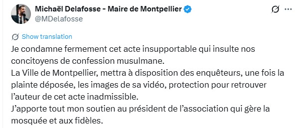 Le maire socialiste de Montpellier, Michaël Delafosse, a également condamné « fermement » cet « acte insupportable qui insulte nos concitoyens de confession musulmane ». Il a promis de « mettre à disposition des enquêteurs » les images de vidéo protection pour « retrouver l’auteur de cet acte inadmissible ».