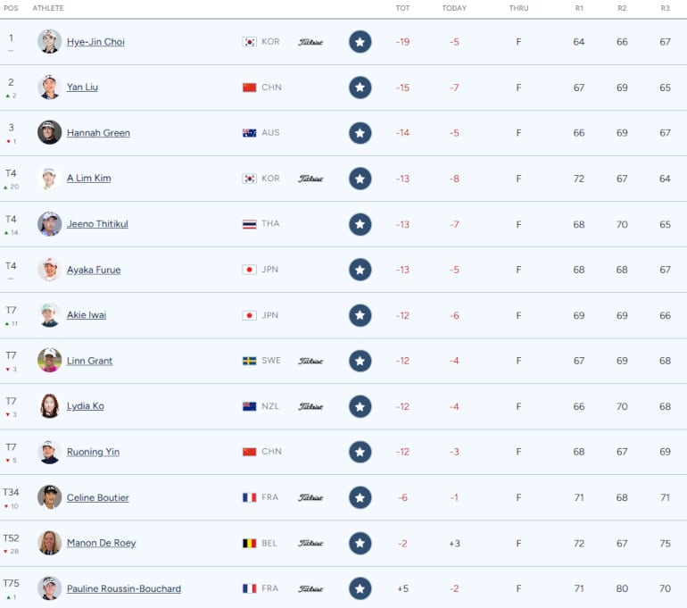 Malgré un double-bogey dès le trou numéro 3, l’Australienne Hannah Green complète seule le podium à-14, juste devant la numéro un mondiale thaïlandaise Jeeno Thitikul. La star néo-zélandaise Lydia Ko et la tenante du titre chinoise Ruoning Yin sont dans le top 10, à sept coups de Choi.