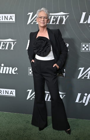 Jamie Lee Curtis était au centre de l’événement prestigieux Variety Power of Women présenté par Lifetime à Los Angeles. L’actrice a misé sur une tenue de soirée monochrome très élégante. En effet, elle a choisi un smoking-pantalon noir, composé d’un pantalon évasé au niveau des jambes et d’un blazer aux épaules structurées, porté ouvert. L’élément central de son look était un haut blanc surmonté d’une grande fleur noire au niveau de la poitrine, ajoutant un détail audacieux à l’ensemble. Ses cheveux courts gris et ses lunettes de vue complétaient ce look chic et audacieux.