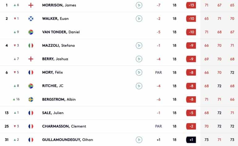 L’eagle au 1 de Félix Mory laissait présager de grandes choses dans ce troisième tour. Cela n’aura finalement été que la seule belle lumière d’une journée assez terne pour le Nordiste. Seuls deux bogeys sur la suite, au 9 et au 14, sont venus animer le reste de son après-midi. Avec cette carte dans le par, le vainqueur du Swiss Challenge au mois de juin dernier a reculé au sixième rang, à cinq unités du leader.