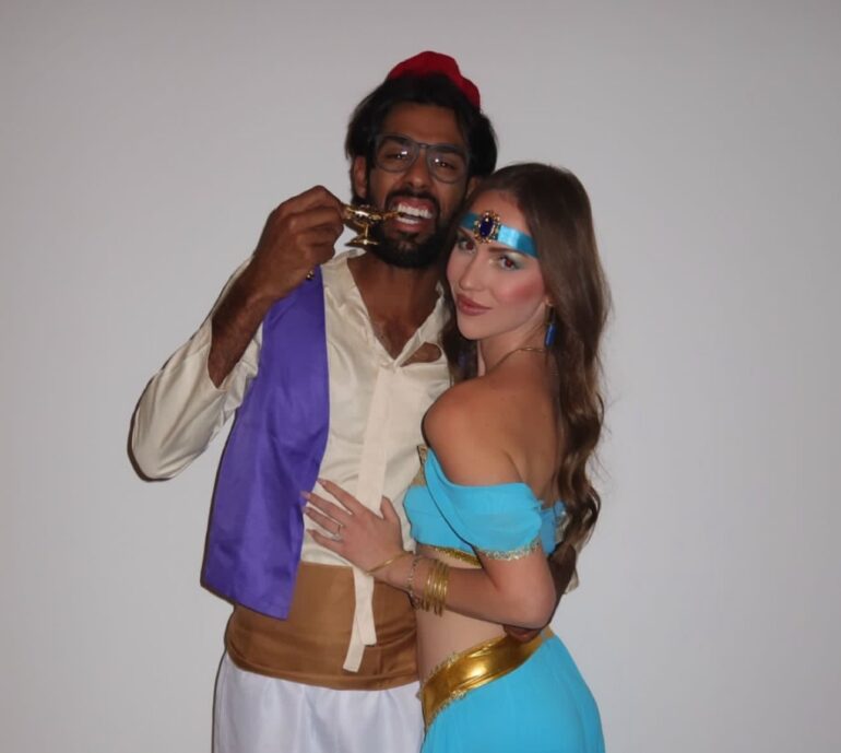 Akshay Bhatia, qui arborait un costume inspiré d’Aladdin avec sa compagne rencontrée sur internet Presleigh Schulz.