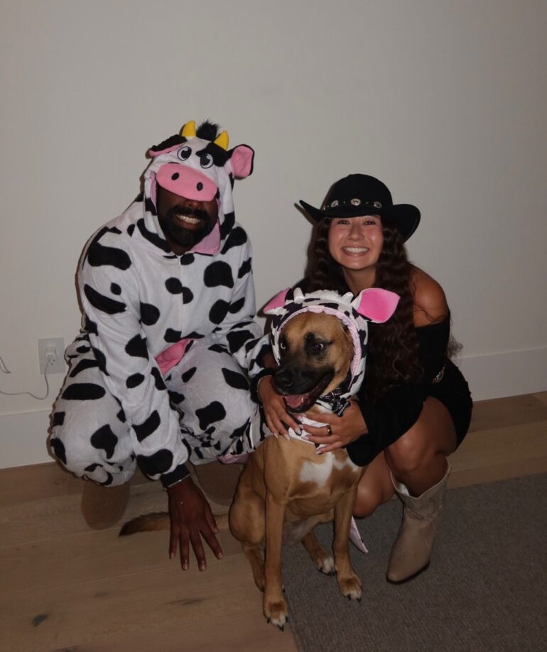 Sahith Theegala, vainqueur sur le PGA Tour, s’est également déguisé pour l’occasion, tout comme sa compagne Juju Chan et leur chien, déguisés en vaches.
