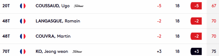 20e à -5 (67), Ugo Coussaud est lui aussi concerné par cette « chasse ». Le membre de la Team St Laurent doit accrocher un top 10 minimum pour espérer entrer dans le top 50 « qualificatif » et être au départ du DP World Tour Championship la semaine prochaine à Dubaï. Il est pour le moment projeté 59e.