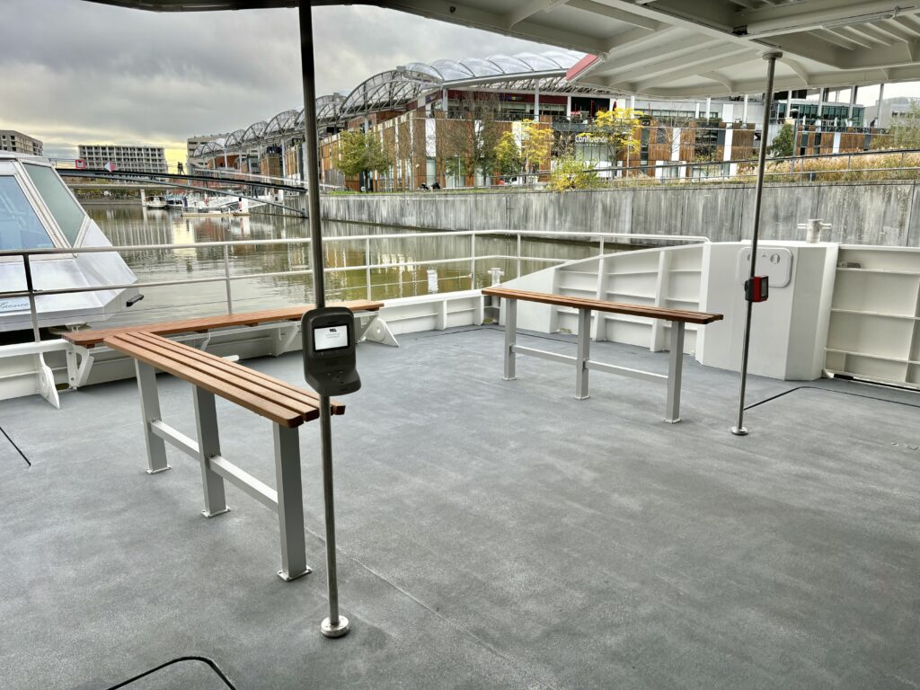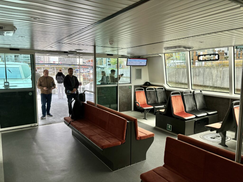À bord, les voyageurs profitent de grandes baies vitrées et d’un espace intérieur doté d’un salon de 55 places, du wifi et de prises 220 V et USB. Les espaces extérieurs offrent 21 places assises et six emplacements vélo. Comme les autres transports, les bateaux disposent d’équipements de billettique TCL et d’annonces sonores et visuelles.