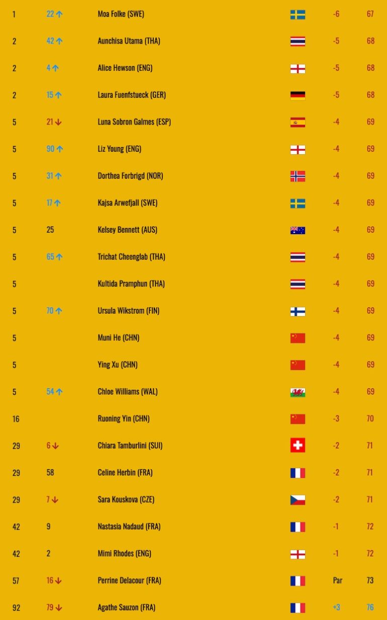 Moa Folke a pris la tête de l’ Aramco China Championship grâce à une première carte de 67 (-6). La Suédoise, qui n’a jamais remporté de tournoi sur le Ladies European Tour (LET), a touché 17 des 18 greens en régulation et signé un eagle et quatre birdies. Elle devance d’un coup la Thaïlandaise Aunchisa Utama, l’Anglaise Alice Hewson et l’Allemande Laura Fuenfstueck.