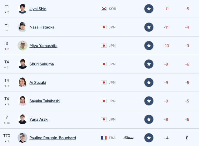 Si la Japonaise Nasa Hataoka continue de mener le bal à Shiga, elle a été rejointe en tête par une Coréenne, Jiyai Shin. Pauline Roussin-Bouchard a mieux négocié ce deuxième tour.
