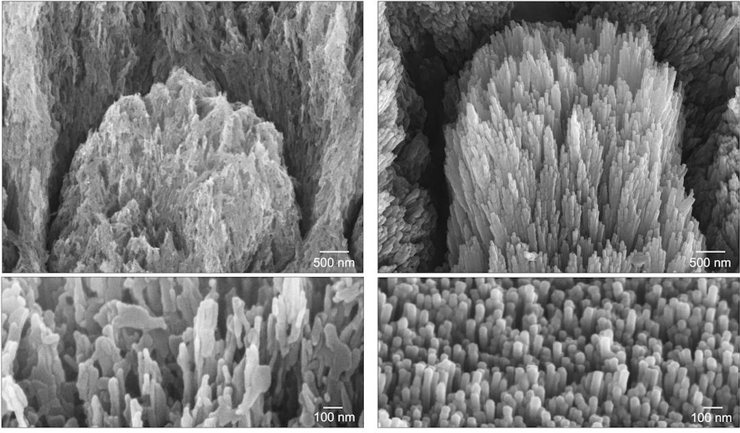 Images de microscopie électronique d’une dent présentant un émail déminéralisé montrant des cristaux érodés (à gauche) et d’une dent déminéralisée similaire après deux semaines de traitement avec le gel, présentant des cristaux d’émail régénérés par épitaxie (à droite). © Professeur Alvaro Mata, Université de Nottingham