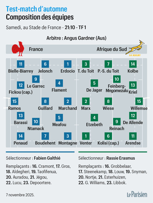 Les Bleus, eux, lancent simplement leur saison. Mélange de références (Fickou, Ramos, Penaud, Ntamack, Bielle-Biarrey, Flament, Marchand…) et de novices ou presque comme les piliers Montagne et Erdocio, ce XV de France compte suffisamment de forces et de talents pour malmener ses bourreaux de 2023. Même sans Dupont. Le capitaine, encore convalescent de son opération du genou droit en mars dernier, prendra place en tribunes. Avec, peut-être, un petit goût amer au fond de la gorge.