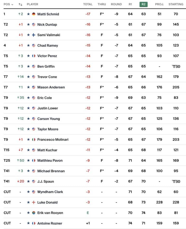 Pour la deuxième journée consécutive, Matti Schmid a signé une carte vierge de bogey. C’est la 5e fois depuis 2022 qu’il parvient à atteindre la mi-tournoi sans commettre d’impair et seul le numéro 1 mondial Scottie Scheffler peut en dire autant.