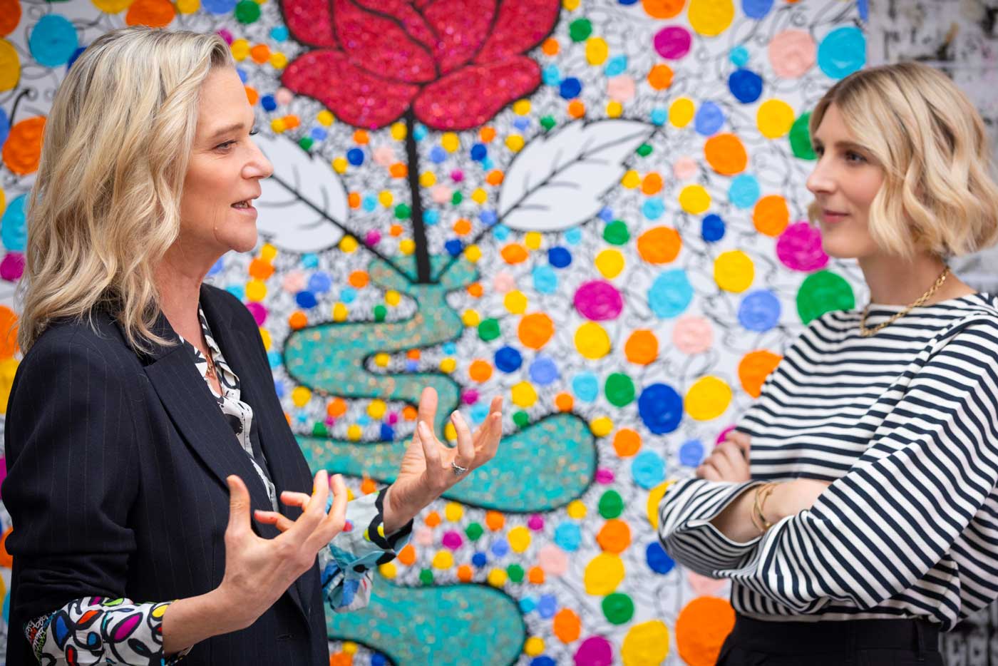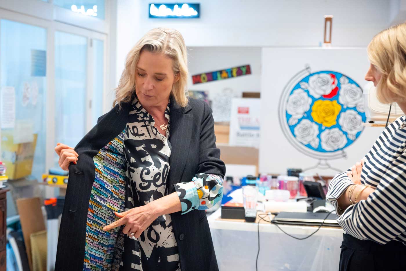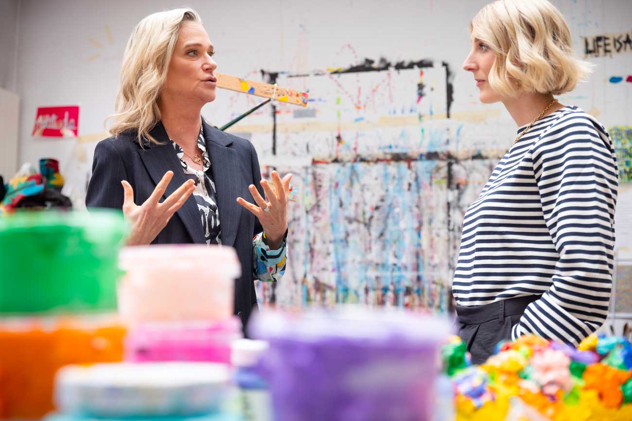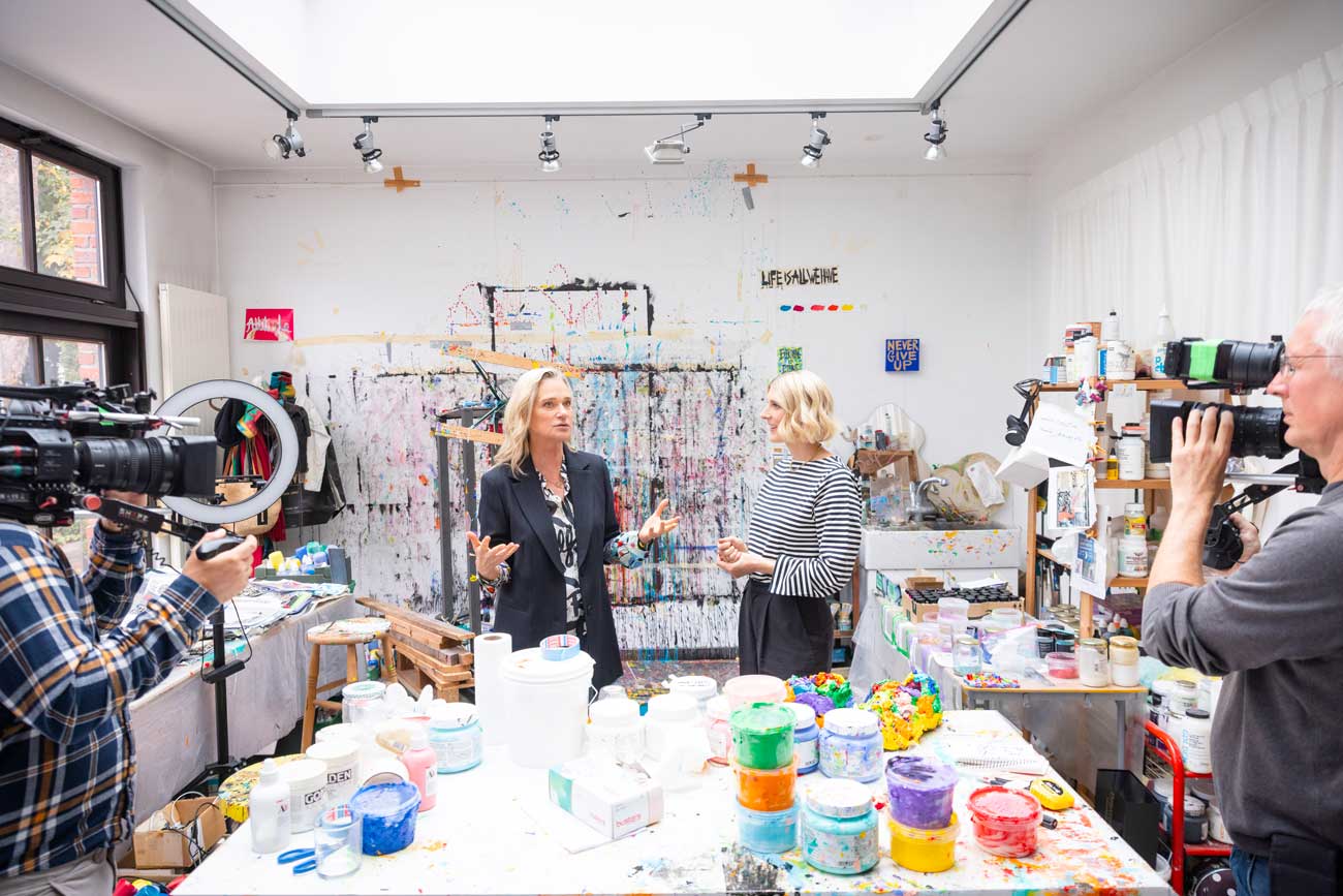 La princesse Delphine emmène Alix Battard à la découverte de son atelier, où elle crée la majorité de ses œuvres (Photo : Olivier Pirard)
