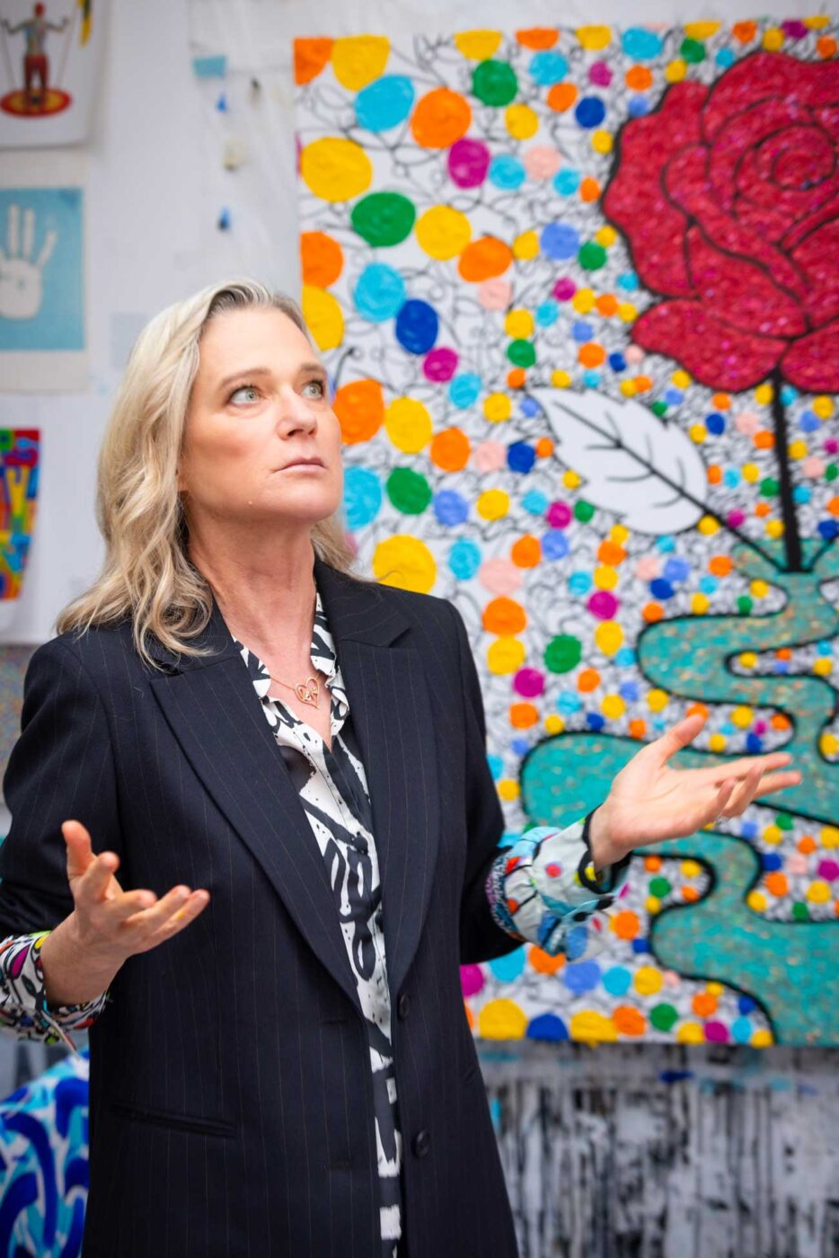 Autrefois revendicatrice et ayant cette volonté d’être entendue, Delphine préfère aujourd’hui répandre des messages positifs et réconciliateurs. « Même si la vie n’est pas toujours évidente, on peut tout de même devenir une rose » et faire en sorte que la vie « soit belle ou drôle », explique Delphine au cours de l’entretien, en expliquant la signification d’un de ses tableaux.
