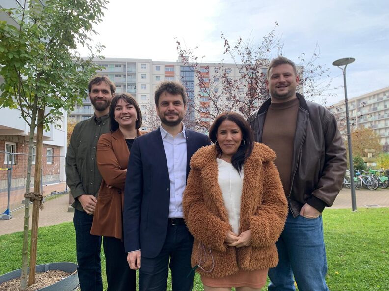 Florian Kobryn, candidat de La France insoumise (LFI) pour les élections municipales de mars 2026, a présenté le programme de son mouvement jeudi 6 novembre. À ses côtés, Halima Meneceur, co-tête de liste et fondatrice du groupe d’action LFI à Hautepierre, Benjamin Kuntz, Lisa Farault, les anciens « chefs de file » et Victor L., coordinateur du programme, qui préfère taire son nom de famille pour préserver son employabilité.
