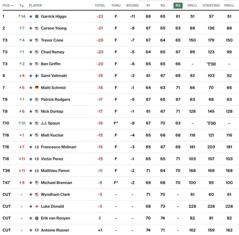 Pas concerné par ce classement général puisque bénéficiant d’une exemption courant jusqu’à fin 2026 sur le PGA Tour, Matthieu Pavon a fait suivre son 64 de la veille par un 70. Auteur de quatre birdies en 14 trous, le Girondin a trébuché sur le 15 enregistrant l’un des 14 double-bogeys ou plus recensés lors du troisième tour. Un seul birdie a été signé sur ce trou, il est l’œuvre de l’Américain Trevor Cone.