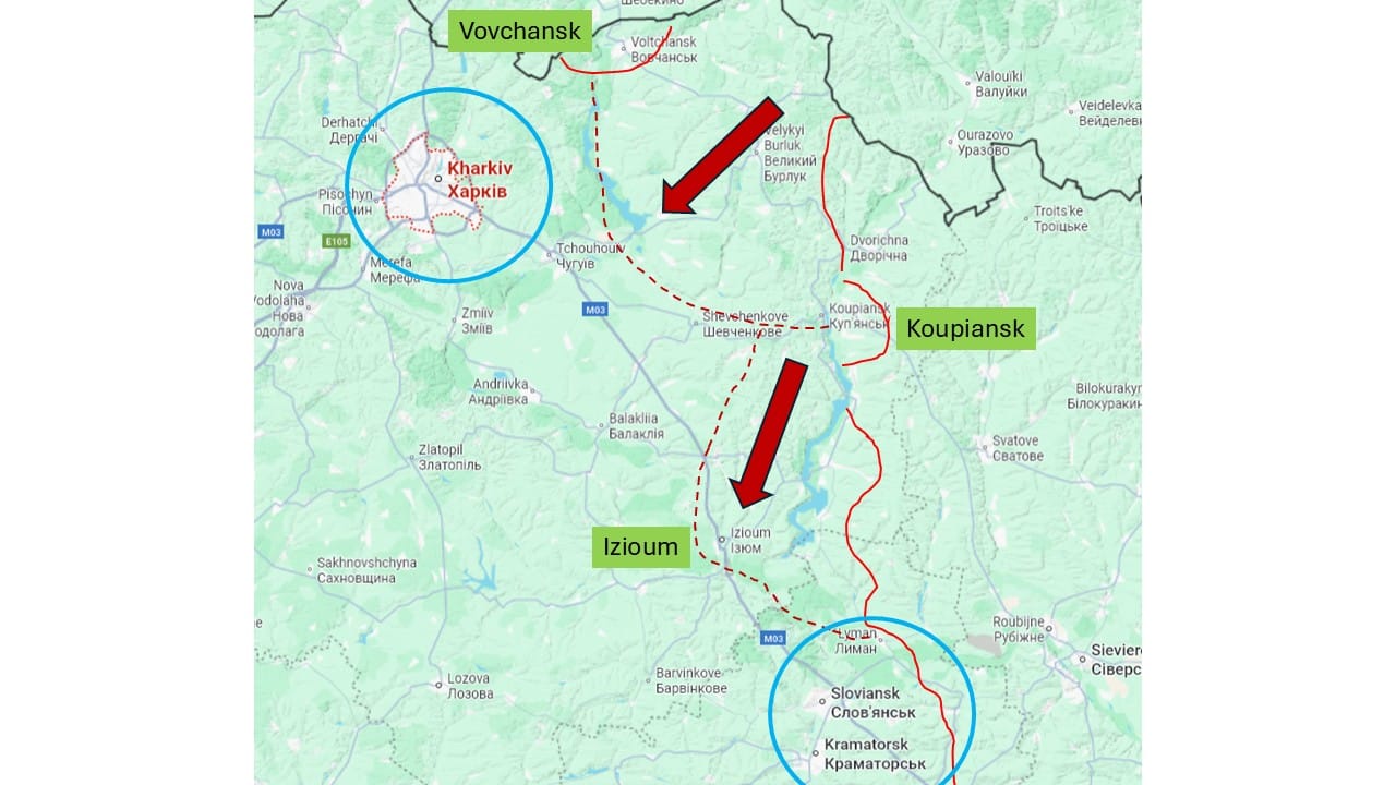 Les Russes ont repris l’initiative au nord, que ce soit à Vovschansk ou vers Dvorichna. Ces secteurs paraissent marginaux mais l’activité indique peut-être une préparation plus large visant à rejoindre le front de Koupiansk à celui de Vovchansk, pour reprendre la poussée en direction de la Donets (et au-delà, aménager un éventuel front contre Kharkiv). Autrement dit, les Russes ne se satisferont pas de l’Oskil et voudront descendre le long de la rive occidentale de cette rivière vers Izioum et donc les arrières de Slaviansk. Ceci explique aussi l’acharnement ukrainien à tenir à Koupiansk, avec efficacité puisque les Russes sont bloqués, là où leur position paraissait très favorable il y a un mois.