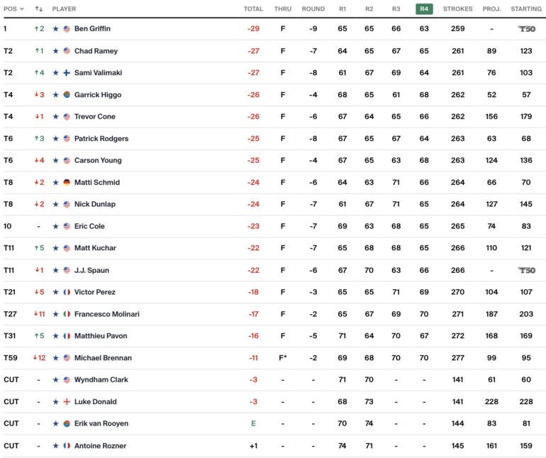 Révélation de la saison, douzième joueur mondial, dixième de la FedEx Cup à l’issue du Tour Championship, Ben Griffin faisait figure de grand favori au début de la semaine. L’Américain de 29 ans, déjà victorieux de deux tournois cette saison, s’est donc logiquement imposé dimanche au terme d’un dernier tour maitrisé de bout en bout.
