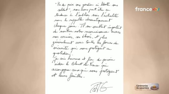 À deux jours des dix ans des attentats du 13 novembre 2015, les Français célèbrent d’autres commémorations, celles du 11 novembre 1918, date de l’armistice de la Première Guerre mondiale. À cette occasion, Jean-Jacques Goldman a décidé de se mobiliser à travers une lettre qui a été lue en direct sur France 2. “Quelques mots magnifiques” écrits de sa main, dévoilés par Maryse Burgot. “Pas de paix, sans gardien, ni de liberté, sans soldat”, débute l’artiste retiré de la vie publique depuis dix ans dans son message manuscrit. “Nous avons peut-être eu tendance à l’oublier, mais l’actualité nous le rappelle chaque jour”, ajoute-t-il. “Il me semblait important de montrer notre reconnaissance envers nos armées, ses blessés et plus généralement toutes les forces de sécurité qui nous protègent au quotidien”, poursuit-il.