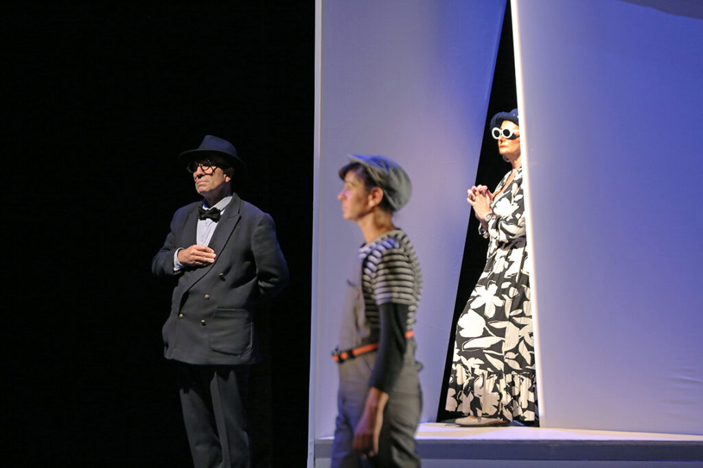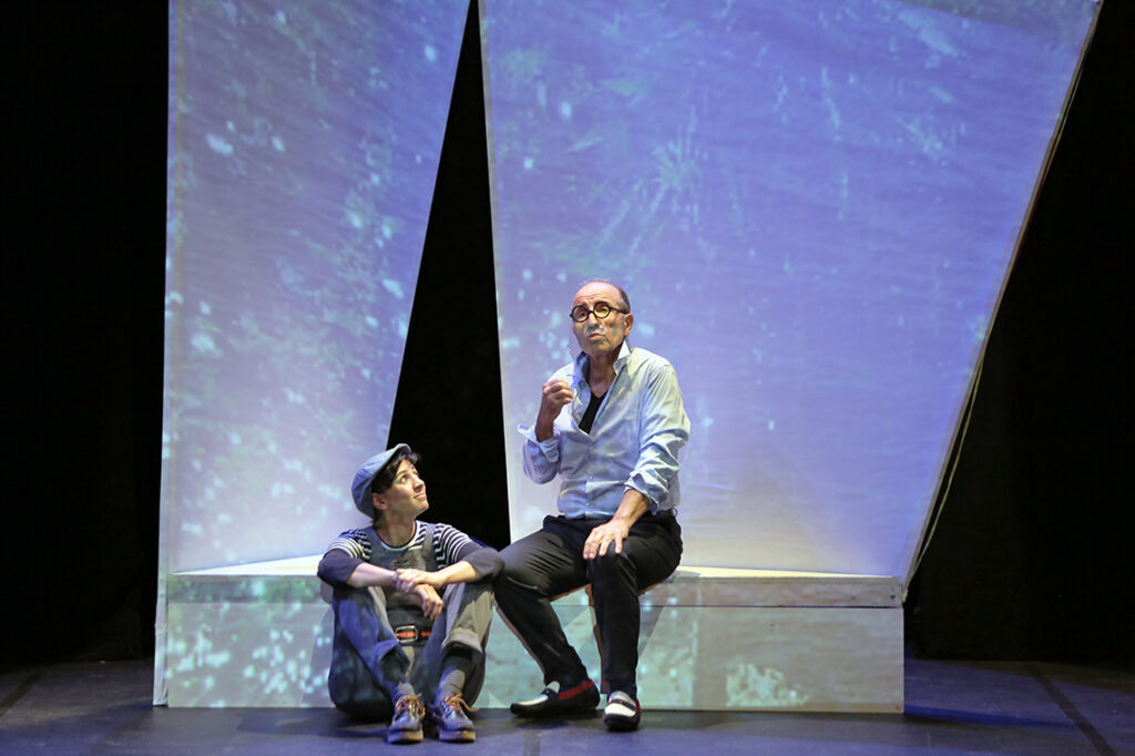 Robertino réussira à 25 ans à intégrer l’un des plus gros cabinets d’architecte et poursuivra, grâce à son travail et à son sens des affaires, une très belle carrière. La pièce explore la magie de cette rencontre sous forme d’étapes d’un voyage, à partir d’une main tendue : celle d’un homme célèbre qui ouvre le monde à un gamin destiné au départ à être plombier. Dans une scénographie géométrique et subtile signée Lucas Jimenez, des panneaux métalliques en forme de voiles de bateau qui se colorent au fil des évocations. Oscar Clark campe l’intrépide héros dont la vie va basculer, et dont le double, Magali Paliès, semble le rattacher sans cesse au réel. Jean-Luc Paliès est un Le Corbusier plus que vraisemblable, costume sombre et lunettes rondes en écaille noire, qui semble jauger la ligne d’horizon de la mer comme celle de son destin. Claudine Fievet incarne son épouse dans de superbes costumes et lumières. Une vraie réussite.